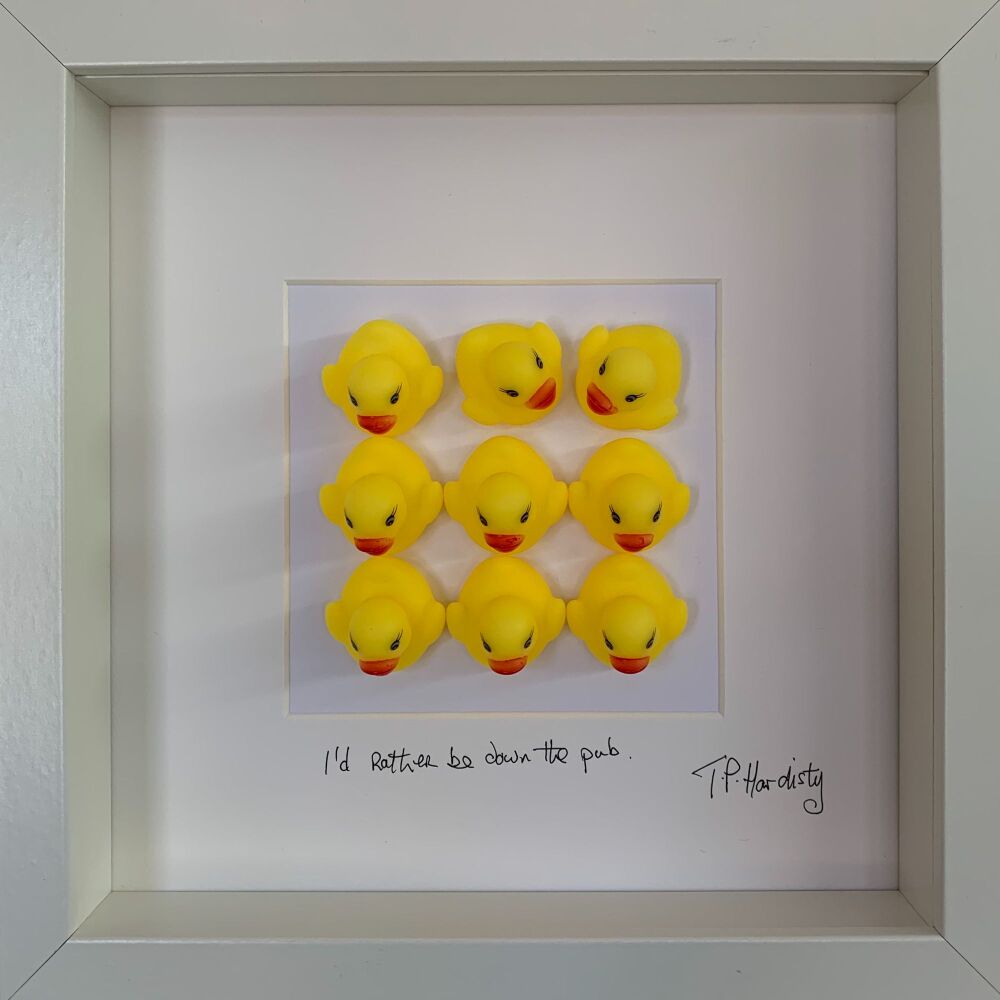 This artworks features a square of 9 toy ducks having a conversation, small limited edition. Supplied framed with a glass front. Size 25cm x 25cm x 6cm.